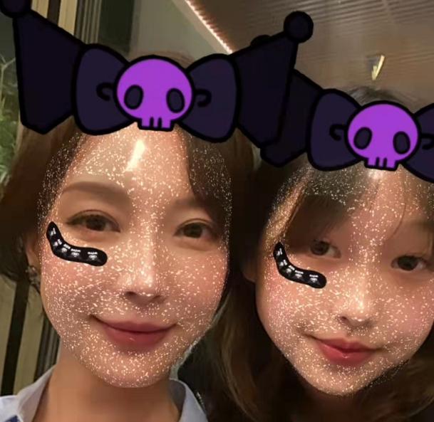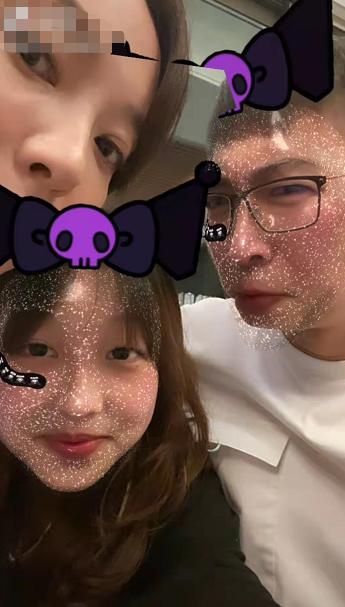 另一张照片中,糖糖带着干爸干妈一起玩动画滤镜,不停做鬼脸。