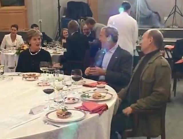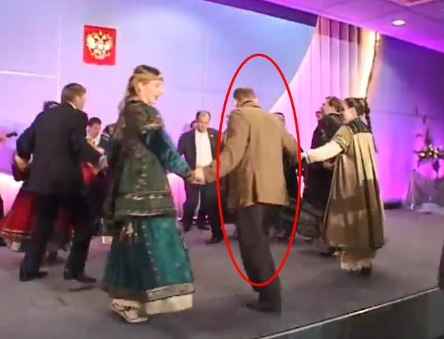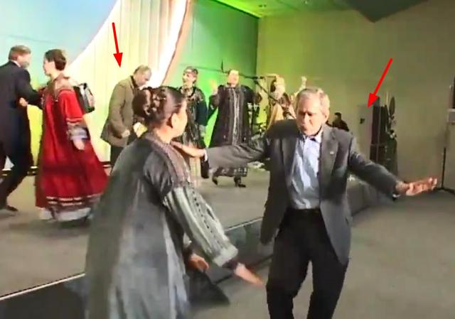 视频显示,普京在舞台上跳起了圆形的舞蹈,而小布什则单独在俄罗斯总统附近的台下与跳起了舞,与他一起跳舞的是一名身穿民族服装的俄罗斯女舞蹈演员。