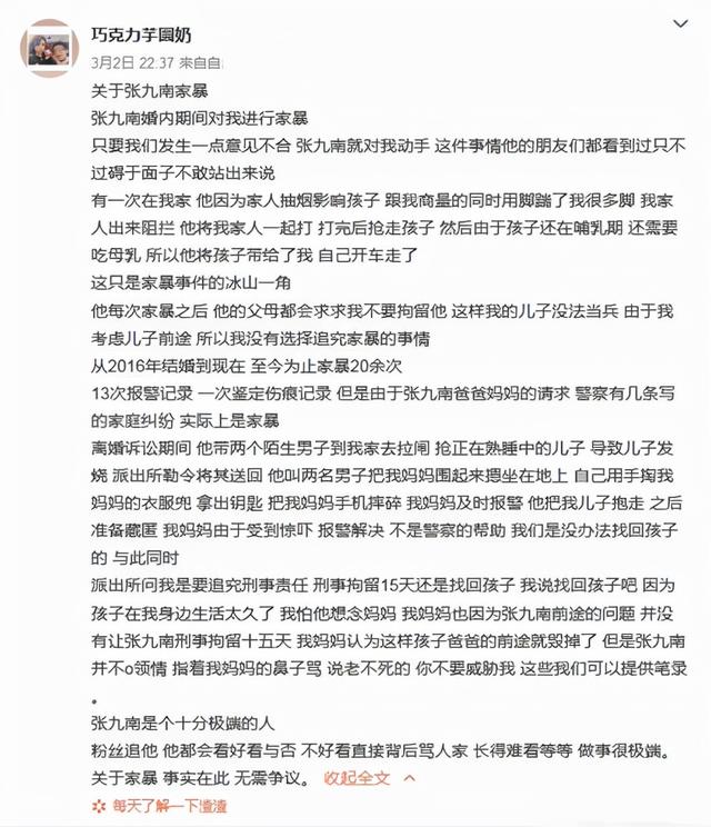 3月2日晚,张九南的妻子裴爽发文控诉张九南,裴爽称自2016年结婚至今,她被张九南家暴了20多次,她还说张九南约粉,出轨多次。