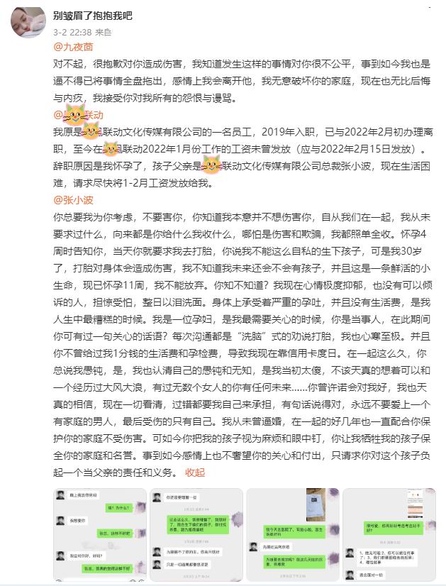 根据这位女网友的爆料,她是张小波公司的员工,和张小波拥有不正当的男女关系。