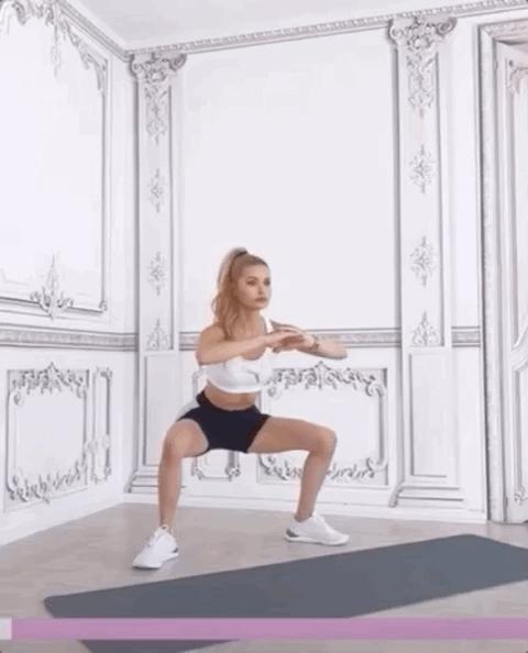 双脚打开站立地面宽度大于肩部,上身保持直立向下蹲,双腿呈现90度后再站直。