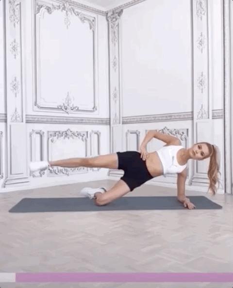 内侧手臂和腿部呈90度弯曲,横着支撑在瑜伽垫上,外侧手臂叉腰腿部绷直向上抬。