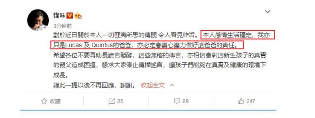 朱叔这些理论完全毫无依据,完全是属于自己的臆想。其实,谢霆锋早在之前张柏芝生下Marcus后,不堪舆论的骚扰,谢霆锋便站出来表明了自己的态度,撇清了和小王子的血缘关系。而他也一再强调只有Lucas和Quintus才是自己的儿子,并会尽心尽力做好这爸爸的责任。