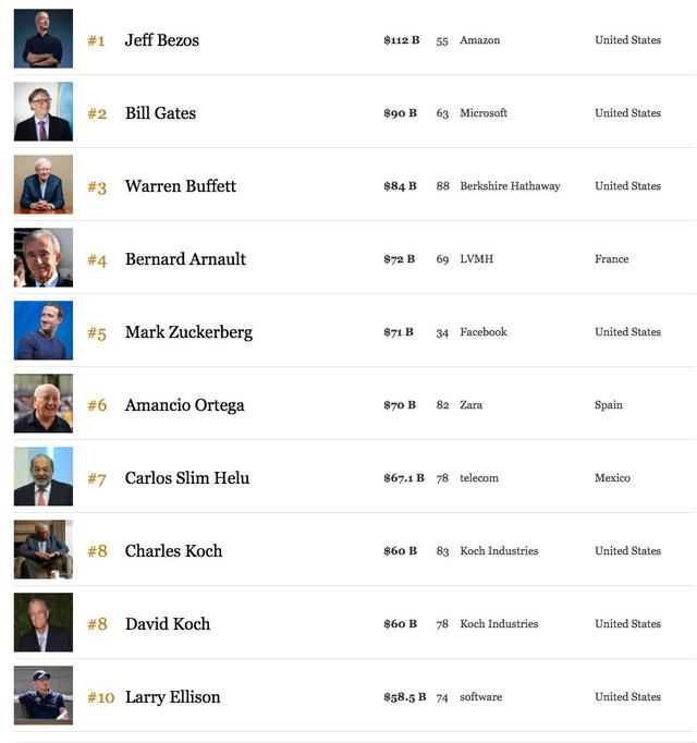 ,折合人民币超过7612亿元,是榜单上唯一身家超过千亿美元的超级富豪。由于数据统计时他还没有离婚,暂时不考虑财产缩水一半的可能。比尔·盖茨、沃伦·巴菲特和马克·扎克伯格也仍然在榜单前列,分别排在第二、第三和第五。34岁