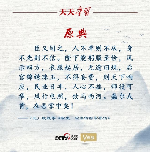 作为北宋的一代名臣,宋祁以天下为己任。宝元二年,面对西北边境战事吃紧、国家财政日益困窘的情况,宋祁向宋仁宗呈奏《上三冗三费疏》,建议“去三冗”、“节三费”,直言朝廷应该精兵简政,节约开支,并劝谏宋仁宗从自身及后宫嫔妃做起,带头节俭,布告四方,这样天下就会群起响应。由此提出了“人不率则不从,身不先则不信”的谏言,意思是在上位的人如果自己不作表率,下面的人就不会跟从;如果自己不身先力行,下面的人就不会信服。