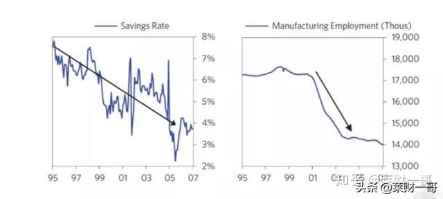 整个经济开始出现泡沫特征,存款利率一降再降,大量海外热钱涌入美国。美国制造业就业下滑,美国大量失去全球出口市场份额,特别是对中国。然而房地产相关的泡沫带来了经济的一轮景气周期。建筑相关的就业人数上升,抵消了出口下滑带来的就业数据下降。海外资金的流入,带来了美国人民持续加杠杆消费。美国人的过度消费是一个泡沫典型特征。
