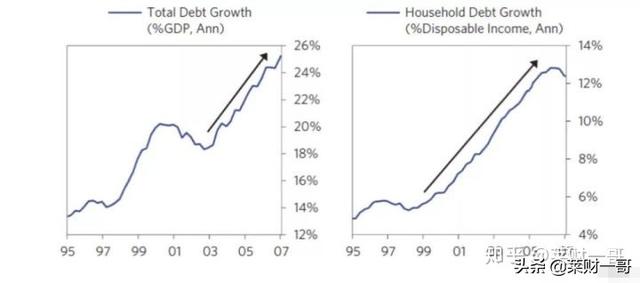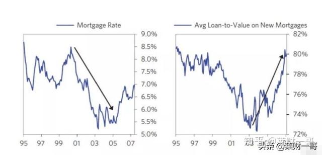 下面两张图也很说明问题。我们看到房贷利率出了很大的下滑。2003年的房贷利率跌到了1950年代最低水平,而且在房地产泡沫中持续保持低位。另一张图我们看到杠杆率在2003到2007年之间大幅提升。甚至是加息周期的2005到2007年之间,杠杆率维持在很高的位置。越来越多的人,支付很小比例的首付就能买房,意味着他们背负的房屋贷款越来越高。次级贷占到了房屋贷款比例的20%。我们会在接下来部分专门讨论这个话题。