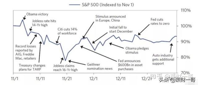 2008年11月4日,奥巴马当选美国总统,他承诺将大幅推动政府开支,特别是基础建设开支,失业率补助金,医疗保险等,他还将支持政府救助资金TARP。通过对于国会的控制,能让奥巴马总统快速行动。这个阶段,经济数据出现了加速下滑。零售销售同比下滑8%,汽车销售量同比下滑30%,失业率创了1994年新高的6.8%,12月制造业数据创了1982年新低。11月10日,美国最大的保险公司AIG公布了250亿美元的季度亏损,房利美季度亏损超过290亿美元,而且两者都获得了1500亿和1000亿的政府援助基金。2008年11月20日,股票再创新低,单月跌幅达到了20%。奥巴马上台后快速行动,任命了盖特纳为下一任财政部长。110月25日,美联储和财政部发布了8000亿美元的救助计划。下图是标普500在11月到年底的走势,我们看到政府的动作不断。全球央行都开始集体释放流动性,并且开始跟随美联储降息到0利率水平。