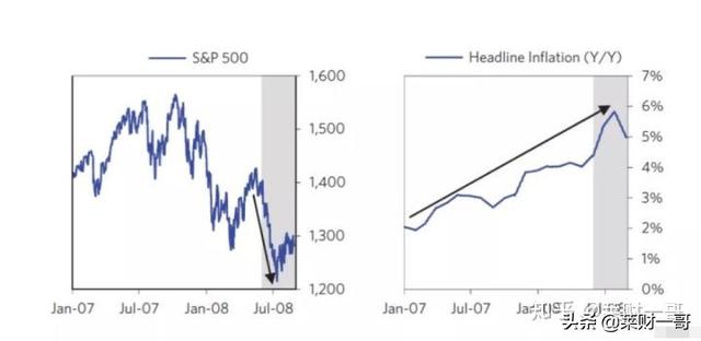祸不单行的是,在经济基本面糟糕的同时,原油价格却不断创新高,在2008年5月创了130美元的历史新高。这让美联储进退两难,持续放松会带来更高的通胀,但不放松,经济基本面又很差。2008年的夏天,美国开始出现了滞涨。下图我们看到,在标普500一路回调的同时,通胀水平不断提高。