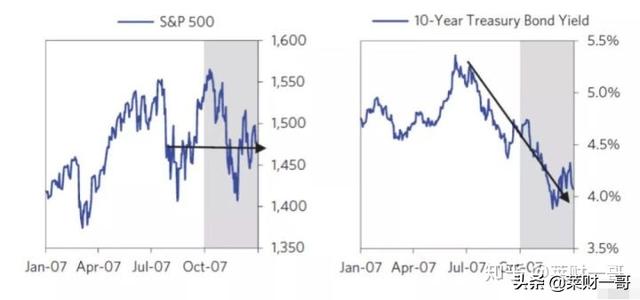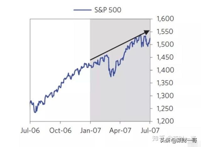 整个三季度投行的盈利已经受到了影响。贝尔斯登三季度盈利大幅下滑61%,就是因为来自其相关对策基金在次贷的头寸出现问题。摩根斯坦利和雷曼兄弟盈利分别下滑7%和3%。市场依然认为风险在可控范围中,2007年10月9日,标普创了当时的新高。这个位置,要到2013年才能达到。最终标普从10月高点到年底收尾下跌了6%,全年依然取得了正收益。12月最大的单日跌幅来自美联储降息25个基点,低于市场预期的50个基点。这一年美元指数下跌了8.6%,而原油上涨了55%达到96美元。