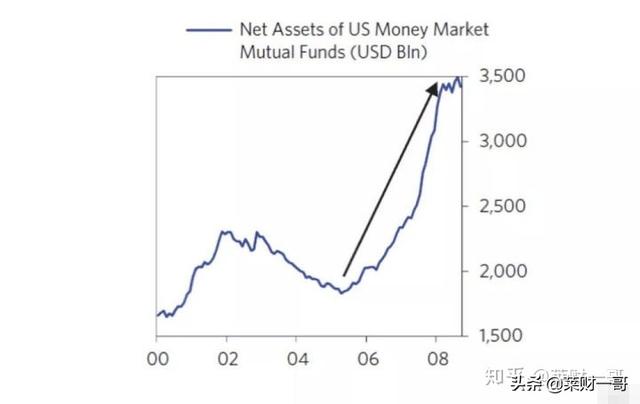 随后一家家投行都面临被“清算”的风险,这导致最终政府出台了TARP来给市场注入流动性。通过给金融企业注入资金,逐步恢复资产价格,带来信心的提升,随后银行也可以进行再融资。高盛和摩根斯坦利也获得了美联储的保护。美联储还出台了保护货币基金的措辞。当时许多人认为货币基金是完全没有风险的,他们将资产大量分散在高收益的债券上。但是一旦流动性出现枯竭,货币市场几万亿美元的资产面临巨大挤兑风险。下图我们看到,货币市场基金规模出现了大幅攀升。