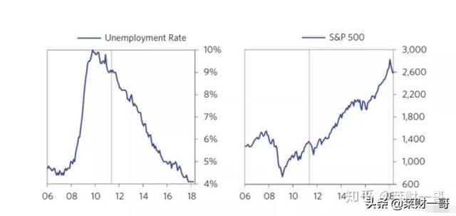 之后的一切都是历史,我们也在大量的文献中看过对于金融危机的描述。美联储主席伯南克在第一次量化宽松之后并没有停止脚步,开始了第二次,以及第三次的量化宽松。在此期间,伯南克也曾经尝试过收紧,特别是在2011年。但那时候又遇到了欧洲债务危机,欧洲金猪5国的CDS价格出现了飙升。在2010年下半年,美国的失业率也维持在高位。下面这两张图,一张代表失业率数据,另一张代表标普500的表现。我们看到拉长看都是表现很好的。但是期间面临各种各样的波折,美联储的持续宽松帮助了经济到今天的完全改善!