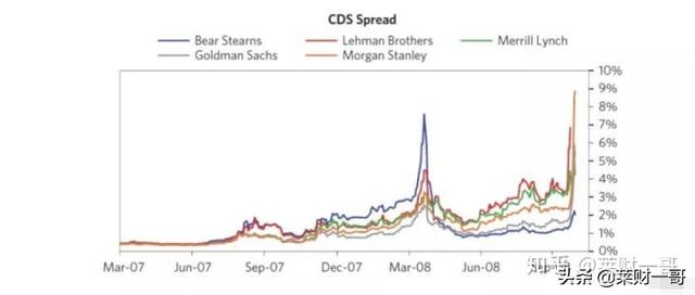 2008年金融危机的最“高潮”当然要数雷曼兄弟的倒闭。在2008年9月初的时候,纽约时报还专门写了几篇文章,说抄底便宜货正在进入市场。当时就专门提到了雷曼兄弟。作为一家有着160年历史的投行,雷曼还是享受非常高的声誉。而这家投行的股价从高位已经下跌了80%。然而,抄底资金没有想到的是,在此之后雷曼的下跌开始加速。在单日出现了50%的巨大跌幅,这时候市场才意识到雷曼是否要倒闭了。下图我们看到各大投行的CDS价格都出现了大幅攀升。