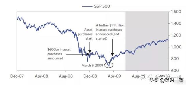 我们再来看一张更加详细的标普500走势图,2009年下半年开始了一系列资产购买的行动。许多人还在犹豫是不是市场还仅仅是一个反弹,接下来还要创新低。此时标普500不知不觉走了出来。我们看到下面这张图,标普500其实有一个双底的过程。两个都是对应天量的资产购买计划开始。