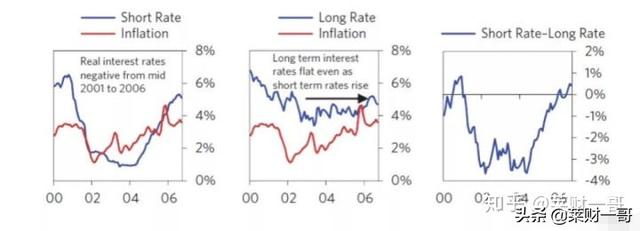 在整个债务开始叠加,房地产市场进入泡沫的阶段,经济却没有出现过热迹象,通胀也保持平稳。所以仅仅盯住这几个指标的美联储,并没有感到担心。通常来说,最差的债务泡沫都没有出现物价和服务价格的通胀水平上升,但是资产价格由债务增长推动。通常情况下,央行会错误的让债务继续增长下去。在下面这几张图中看到,由于通胀水平并不高,美联储在泡沫扩张期间维持了低利率水平。事实上从2001下半年到2006年上半年,美联储的短端利率水平比通胀水平还要低。当美联储在2004年中开始加息时,长期利率水平没有变化,实际利率水平还出现了下滑。