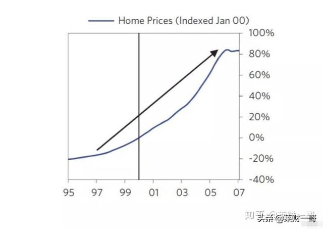 2004到2006年之间,房屋价格上涨了30%,并且相比2000年上涨了80%,这是二战之后房屋价格涨幅最大的十年。在房地产泡沫形成中,开始了一轮自我循环。假设一个家庭用5万美元支付了一个价值25万美元房子的首付,然后放假从25万上涨到了35万。这个家庭的投资翻倍。这也带来更高的借贷比例,更多的人进入房地产市场。下图我们看到2000年以来开启了一轮美国的房地产泡沫。