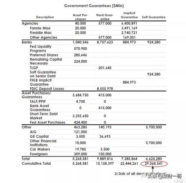 第二天市场就暴涨6.4%,其中花旗集团大涨38%。公司的CEO向员工发布声明,说他们依然还在盈利。之后政策也开始了反击,不断出台利好。3月18日,美联储宣布将扩大量化宽松QE的购买规模至7500亿美元,并且将用最多3000亿美元购买国债。到了3月23日,财政部长盖特纳宣布了5000到10000亿美元的有毒资产收购计划。当天,标普暴涨7.1%,其中金融股大涨18%。3月24日,美联储和财政部向市场传递了一个重要信号:大而不倒。那些巨大的金融企业,政府是不会让其倒闭的。从保险公司,到对冲基金,到私募股权基金。通用汽车和克莱斯勒汽车变成了有缓冲的破产,联合工会一起解决公司的债务。下面这张图我们看到,由美国政府扶持的债务达到了惊人的29万亿美元!