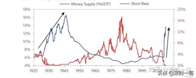 历史总是那么相似,在面临大萧条的时候,选择释放天量流动性并且压低利率价格,成了政府以及央行一致行动的决策。这一次美联储出台的是量化宽松。我们从下图看到,货币供应在1929年大萧条之后出现了巨大的增长,并且伴随着利率水平见底。而这一次同样出现了巨大的增长,同样伴随着利率水平的见底。