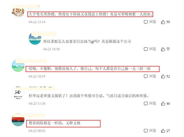 也有网友直接开怼:“杜华不要碰瓷!”其实,有关“碰瓷”一说,可以说一直困扰着杜华,因为她近些年来的穿衣风格似乎经常撞脸杨紫,甚至一些身体举止、发型等都颇像,以致于一些网友对于两个人究竟哪一个是杨紫傻傻分不清楚。