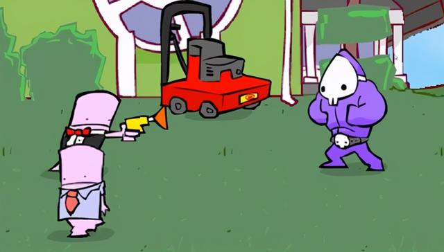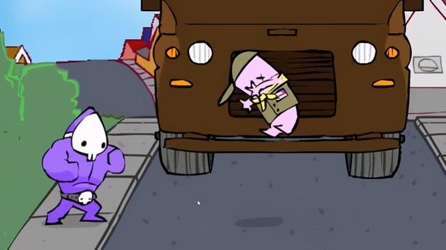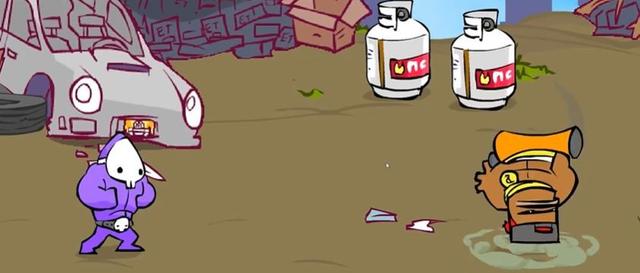 到下一个场景,有一个身着西装革履的小朋友会一直朝霸霸发射马桶吸。
