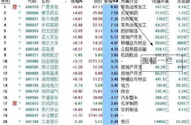 如上图,振幅一栏可直观看出当天个股的波动幅度。