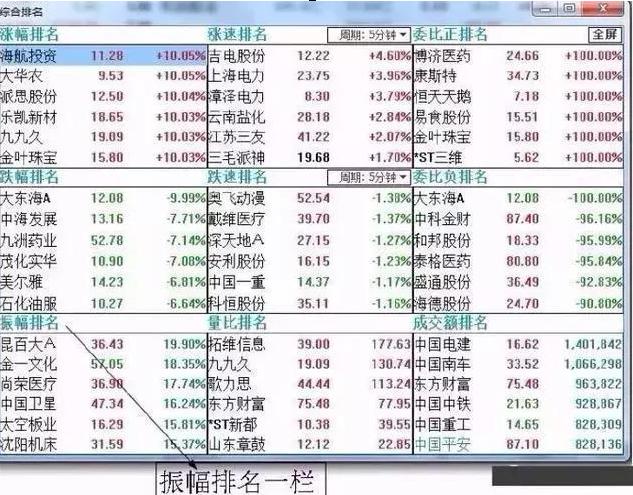 如上图,也可以从“综合排名”里找出“振幅排名”一栏。可以轻易看出当天振幅最大的股票。