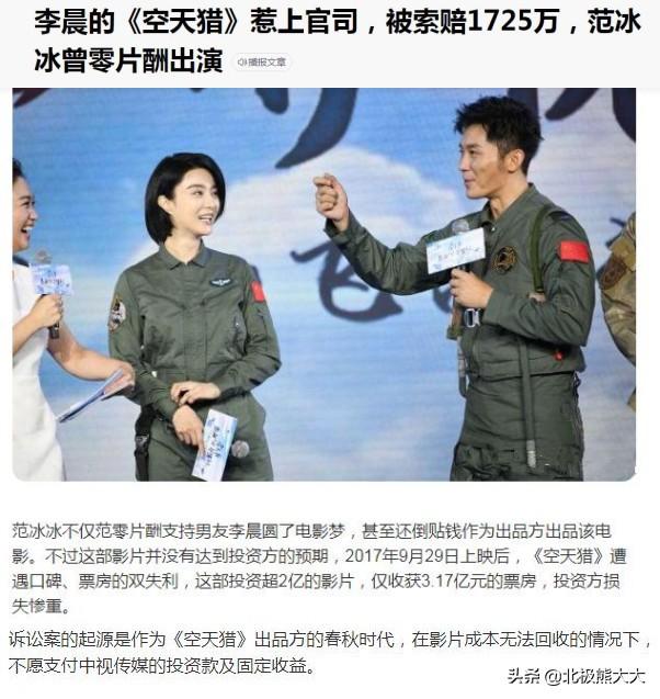2017年,李晨执导并主演现代空战题材电影《空天猎》,冰冰姐为了给男友捧场,不惜零片酬出演,甚至还倒贴钱作为出品方出品该电影。