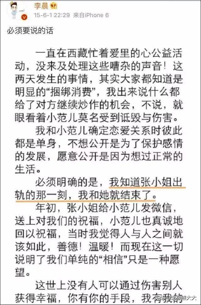 为了保护新欢范冰冰,也为了和张馨予撇清关系,李晨先发制人,发文回应了他和张馨予的关系,称是张小姐出轨在先,自己和范冰冰在一起的时候已经和张小姐分手了。