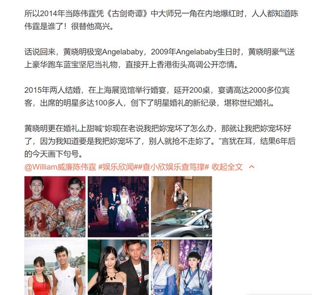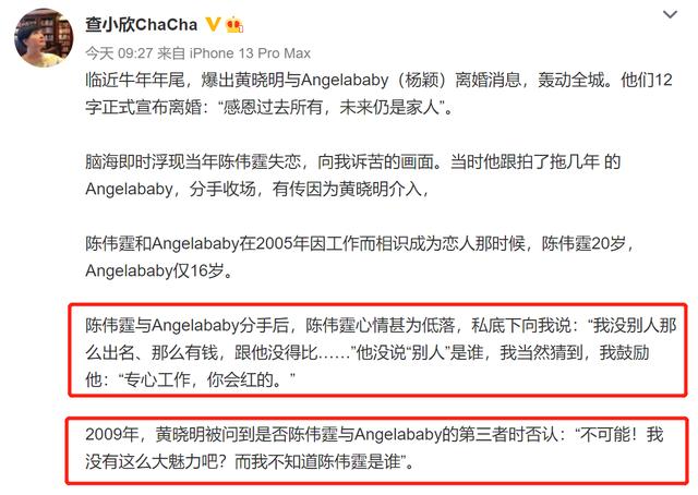 这不,资深八卦媒体人查小欣就在29日发文谈到了黄晓明baby离婚,同时她提到了另一个人,那就是baby的旧爱陈伟霆。