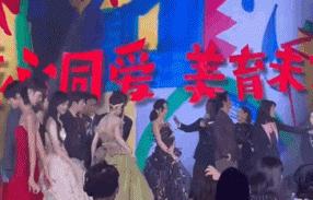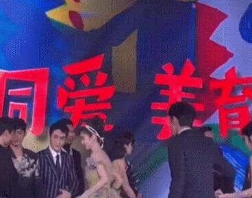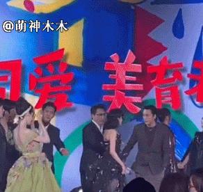 比起阿SA,陈伟霆跟baby的咖位相近,两人站的也比较近,在大合影时,baby上台就迎面撞向陈伟霆,她尴尬到原地圆圈圈。
