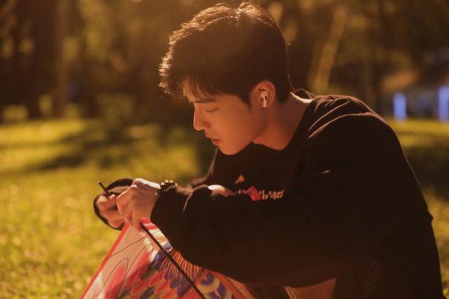 照片是在黄昏时拍摄的,照片中肖战拿着风筝在认真地捣鼓着,童心满满!表情真的是宁静而又美好,阳光还未消散,整个人被淡淡的阳光照射,感觉像是会发光一样,也太帅了吧!
