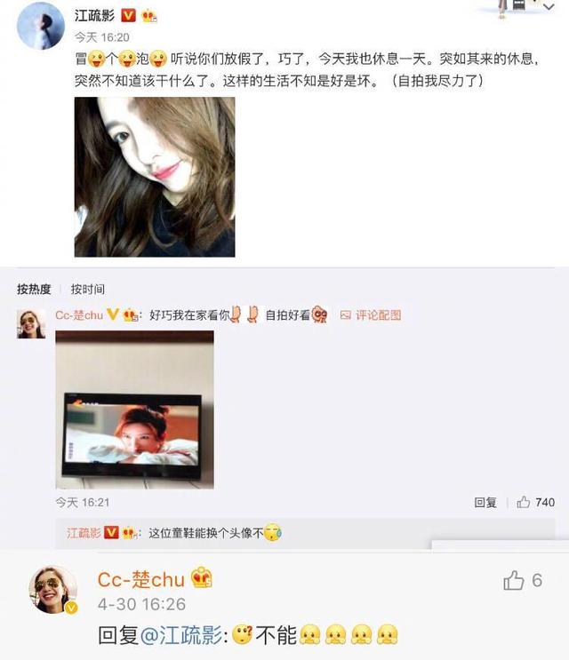 不过放假的江疏影可没闲着,在评论区回复粉丝。一个粉丝评论:“好巧我在家看你,自拍好看。”随后江疏影回复:“这位童鞋能换个头像不?”没想到粉丝果断的拒绝自家爱豆,想想江疏影一脸吃瘪的表情就觉得好笑。