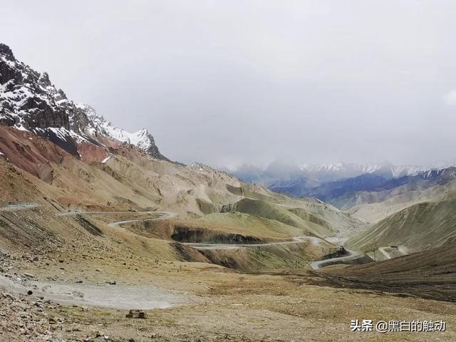 下图是赛利亚克达坂的盘山路。赛利亚克达坂又称麻扎达坂,“麻扎”维语是“坟墓”的意思。这里垭口海拔4969米,是新藏线上最长的达坂,上下各近40公里的连续坡道,山高陡峭,空气稀薄,寸草不生,凶险程度堪为一路所过之最。