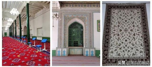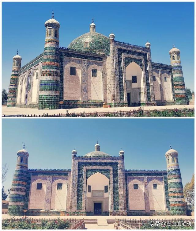 香妃墓周围还建有香妃故园、高低礼拜寺、加满清真寺、门楼等建筑,极具古老的维吾尔风情。下图为高低礼拜寺,高寺供夏季做礼拜用,低寺供冬季礼拜。其建筑风格独特,装饰华丽,寺内木柱精雕细刻,有藻井式天棚彩绘、石膏雕花和砖雕结合的墙体装饰,图案组合多变,色彩搭配和谐统一,堪称维吾尔建筑之精华。