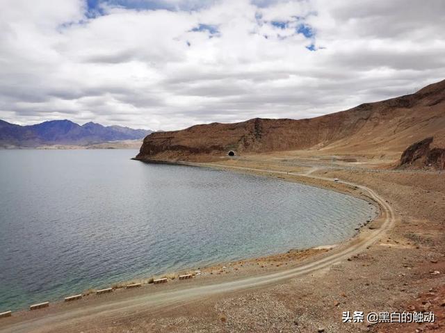 班公湖最为奇特之处在于它是一个由东向西水中含盐量不同的湖泊,我国境内的东部为淡水湖,印控克什米尔境内的西部为咸水湖。下图湖畔公路远方的山体,像不像一头吞海的鲸鱼?隧道正如眼睛。