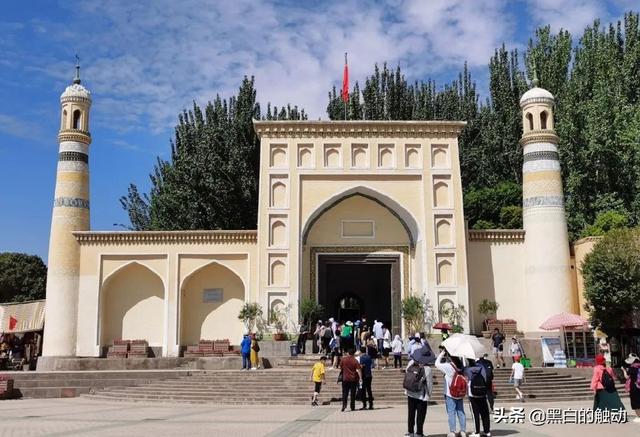 古城一街之隔是艾提尕尔清真寺,始建于1468年,由大殿、教经堂、院落、宣礼塔和大门组成,南北长约140米,东西宽约120米,是全国最大的清真寺之一。