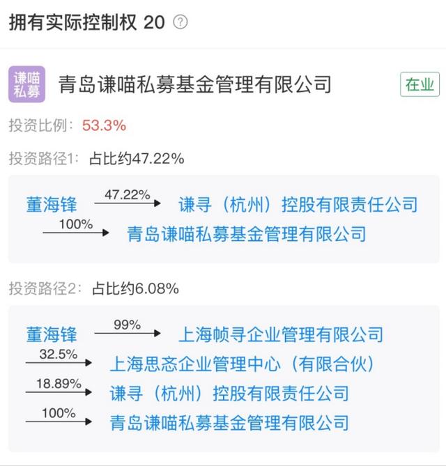 薇娅进军私募了?果然,有钱人都是这样玩儿的!据天眼查显示,1月28日,青岛谦喵私募基金管理有限公司成立,经营范围包括私募股权投资基金管理、创业投资基金管理服务等。该公司由谦寻控股有限责任公司100%持股,其疑似实际控制人为董海锋,共持股53.3%。