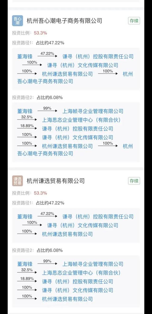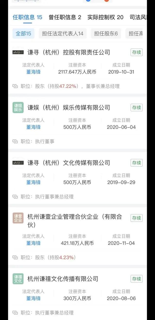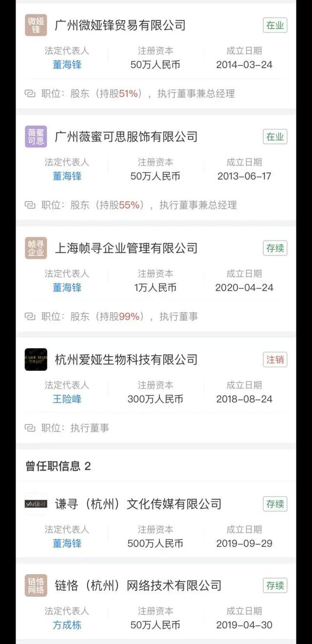 除了谦寻控股和杭州谦寻电子商务,董海锋还是旗下13家公司的法人,而这些公司中的大多数都集中在2019年及之后注册成立。可以说,薇娅夫妇二人早已悄悄布局了庞大的商业版图。