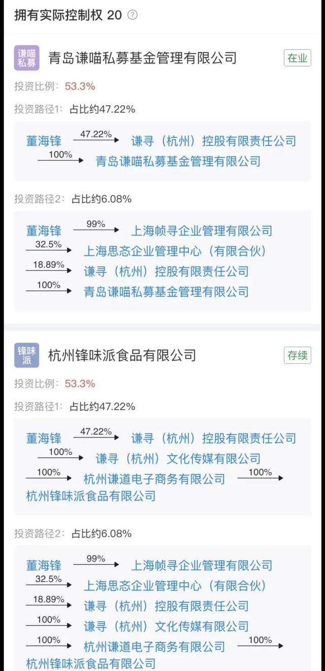 就在最近三个月,薇娅夫妇又密集成立了3家公司,分别为杭州谦壹企业管理合伙企业、上海琅谦企业管理有限公司、杭州锋味派食品有限公司。其中杭州谦壹主营企业管理和咨询,披露的股东共有12位,黄韬持股51.53%为最大股东,薇娅持股5.03%为第五大股东,董海锋为第六大股东,持股比例为4.23%。