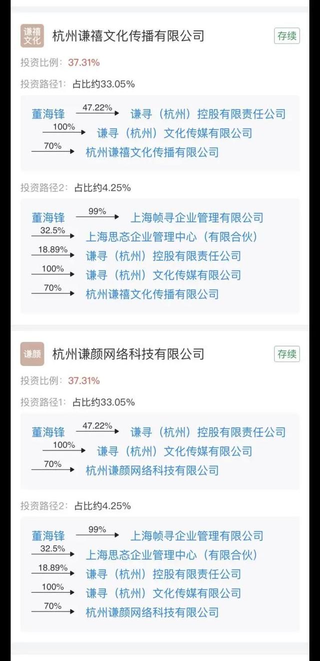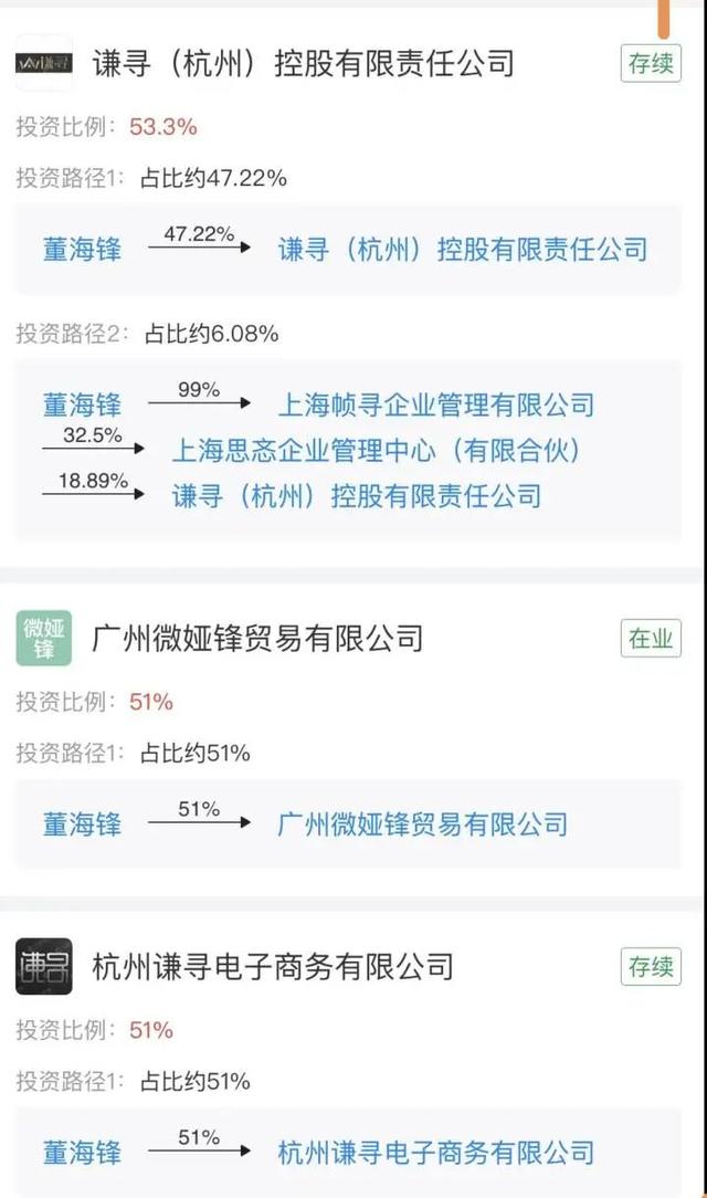 而据天眼查,早于谦寻文化,董海锋主要通过杭州谦寻电子商务有限公司运作,于2016年11月成立,可以说,谦寻电子商务是薇娅夫妇事业真正起飞的开始,继而以“薇娅背后的机构”被大众所熟知的谦寻一路发展到短视频、红人孵化、整合营销等领域。