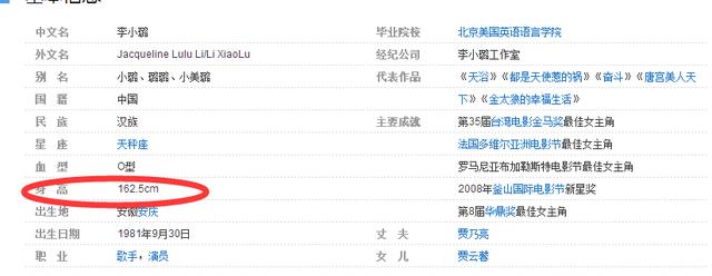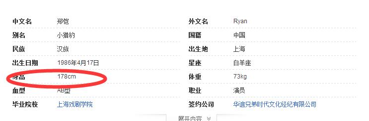 从小编百度百科的身高截图可以看出,四人之中刘烨的身高最高,是186cm,郑恺其次178cm,赵丽颖第三165cm,李小璐最爱162.5cm,那么我么先以赵丽颖为参照物,假如赵丽颖的身高是实在的,那么赵丽颖比郑恺矮13cm,郑恺就比刘烨矮8cm,那么问题来了,比郑恺矮13cm的赵丽颖到郑恺的眉毛处甚至要上一点,而比刘烨矮8cm的郑恺却不到刘烨的眼睛,那么到底谁的身高是弥天大谎了呢?按照这个逻辑郑恺至少虚报5CM了!!!