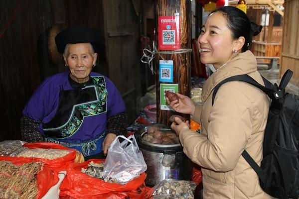 苗寨旅游为村民拓展增收途径,古丈县墨戎镇龙鼻嘴村,游客向当地村民购买土特产