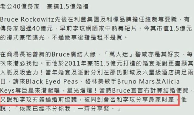 有趣的是,当时婚变传闻一出,港媒速扒李玟身家。不得不说,李玟和Bruce可谓强强联合,资产雄厚。