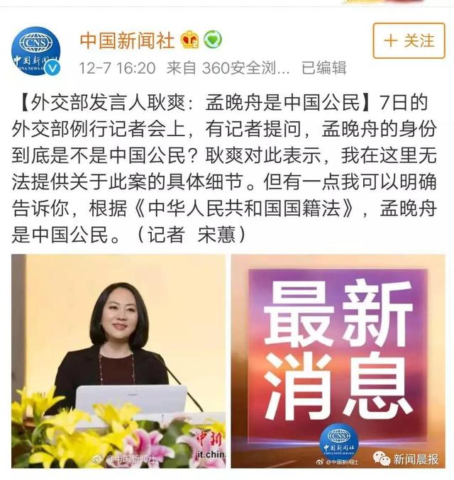 据中新社消息,在12月7日的外交部例行记者会上,有记者问及华为CFO孟晚舟的国籍问题。