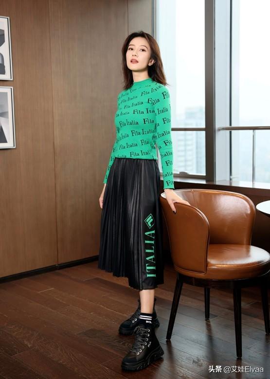 穿衣款式简单不要紧,但是一定要突出衣品的重点,上下之间不能过于单调。像高圆圆这一身就是很好的示范,字母logo上衣,简单得不能再简单,可是在下装方面,皮质百褶半身裙的款式,巧用塞衣美化了身材,露着半截小腿,时髦个性又好看。
