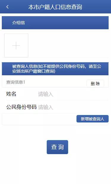 3.1上传“介绍信”,不能提供公民身份号码,请至公安派出所户籍窗口查询。输入被查询人姓名、公民身份号码,多个被查询人点击“新增被查询人”按钮。点击“查询”按钮。申请界面 如图03-1 个人信息展示界面 如图03-2