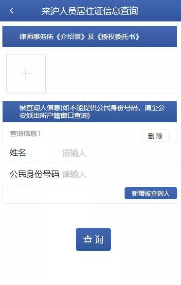 鼓励律师通过“上海公安人口管理”微信,使用线上查询功能,经身份认证后登陆系统,按照系统提示输入被查询人的准确姓名和公民身份号码,上传注明查询事由和本提示第二条所述材料,即可实现自助查询。