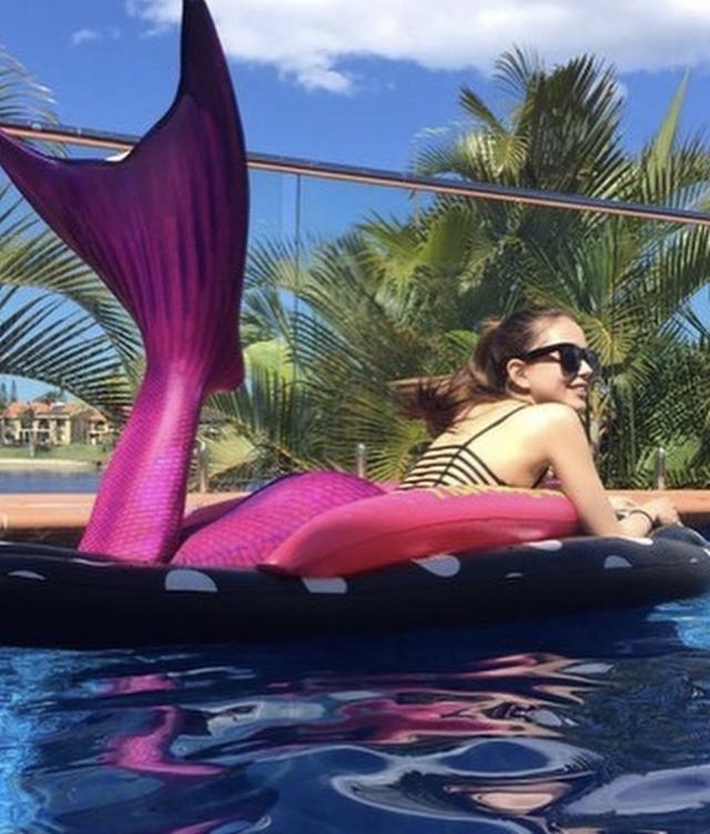 昆凌趴在气垫上,穿着吊带秀出美背,扎着马尾辫青春洋溢,阳光下笑容甜美,这鱼尾泳衣乍一看像是做的后期特效,十分梦幻。