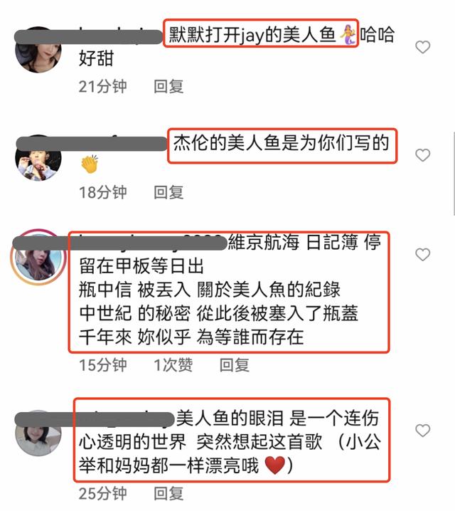 不少粉丝都立马想到了周董的一首歌就叫《美人鱼》,默默地打开了歌单回味起来,甚至还直接把歌词放在评论区。网友感慨这首歌分明就是为母女俩写的。