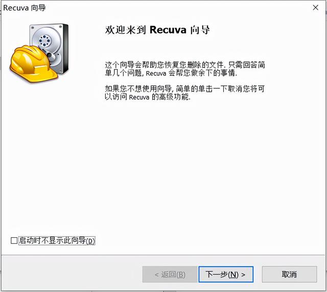 :下载到Recuva后,双击软件图标打开软件,最好是选择以管理员的身份进行打开,以免权限不够导致数据读取失败,进入到向导后选择下一步: